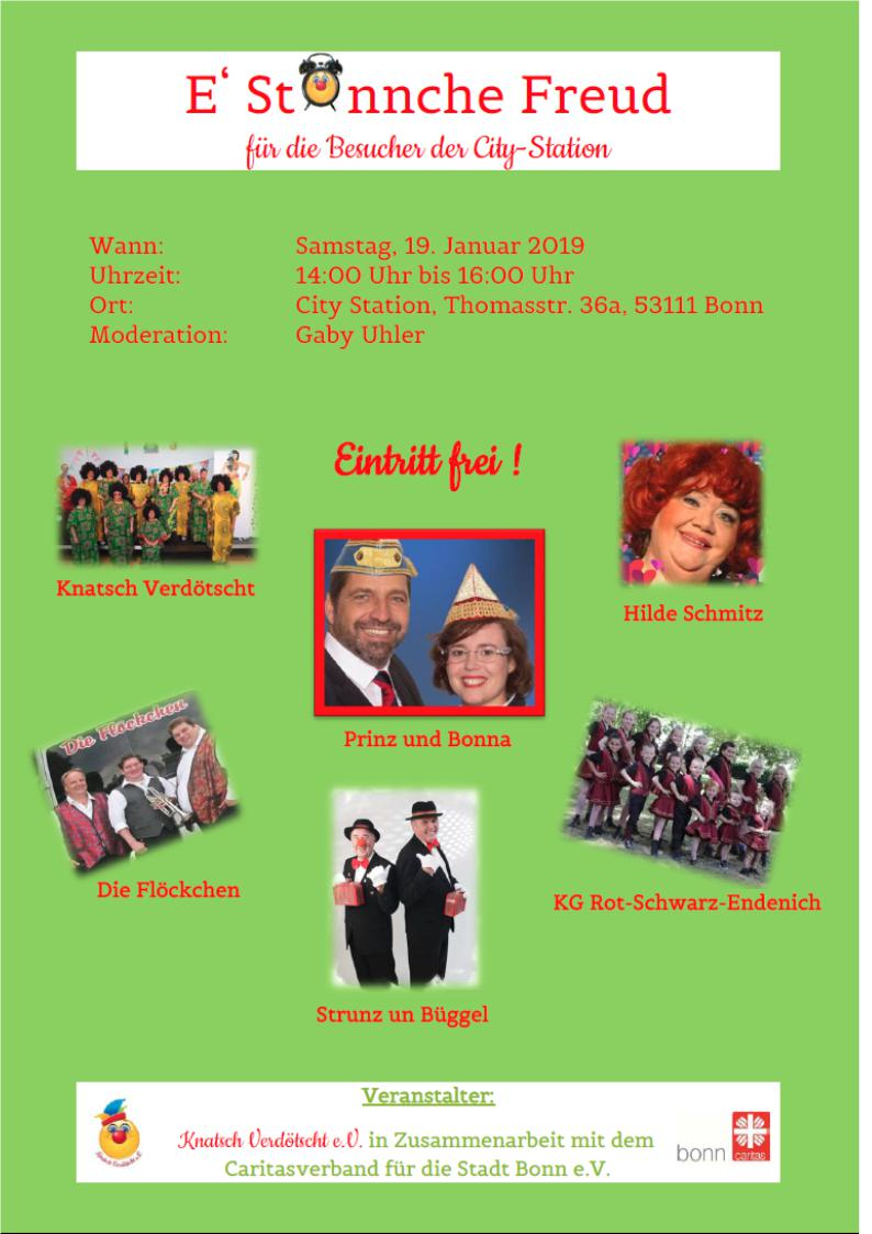 Am 19.01.2019 fand in Zusammenarbeit mit der Caritas Bonn e.V. unsere erste Veranstaltung für Besucher der City-Station statt. Es traten auf Die Flöckchen, die Kindertanzgruppe der KG Rot-Schwarz Endenich, Strunz un Büggel, Hilde Schmitz (Scala Theater Köln) als Trude Herr und zum krönenden Abschluss das Bonner Prinzenpaar. Es war ein unvergesslich schönes Erlebnis, das sich auch in den Gesichtern der Besucher der City-Station widerspiegelte: E' Stönnche Freud!